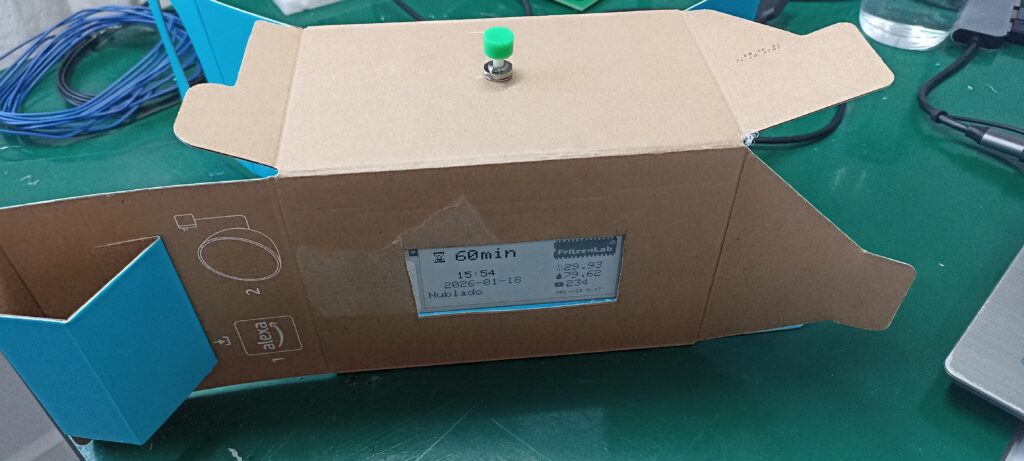 Ao pressionar o botão entre uma e quatro vezes, você seleciona o tempo entre 15, 30, 45 e 60 minutos. Logo em seguida este tempo já aparece na tela e inicia-se a contagem regressiva. A tela de e-paper não pode ser atualizada com muita frequência, devido à sua construção interna. Isso significa que tive que pensar muito bem este projeto: a hora (e minutos) é atualizada a cada sessenta segundos. As demais informações (preço do dólar, temperatura, condição do tempo) somente a cada quinze minutos.