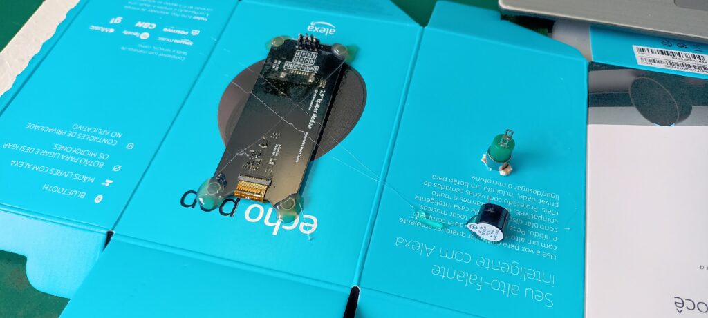 A montagem deste protótipo foi bem rápida, eu utilizei cola quente como meio de fixação. A caixa de papelão utilizada foi onde veio minha Alexa Echo Pop, bem pequena. Veja abaixo o display, o botão e o buzzer já colados.